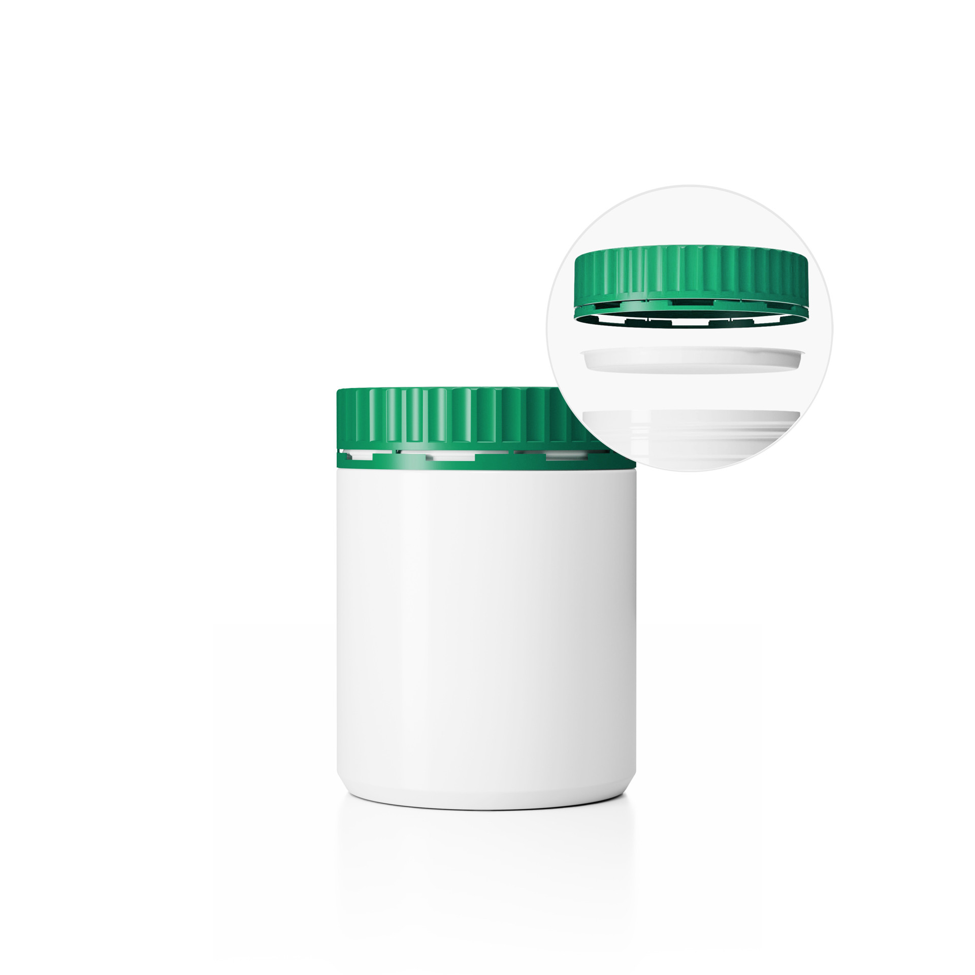 Dóza DL-M 100/100_800 a Uzávěr DL-MZ ø100mm vč. těsnění Plastová dóza HDPE, objem 800ml, barva dózy bílá a barva uzávěru zelená