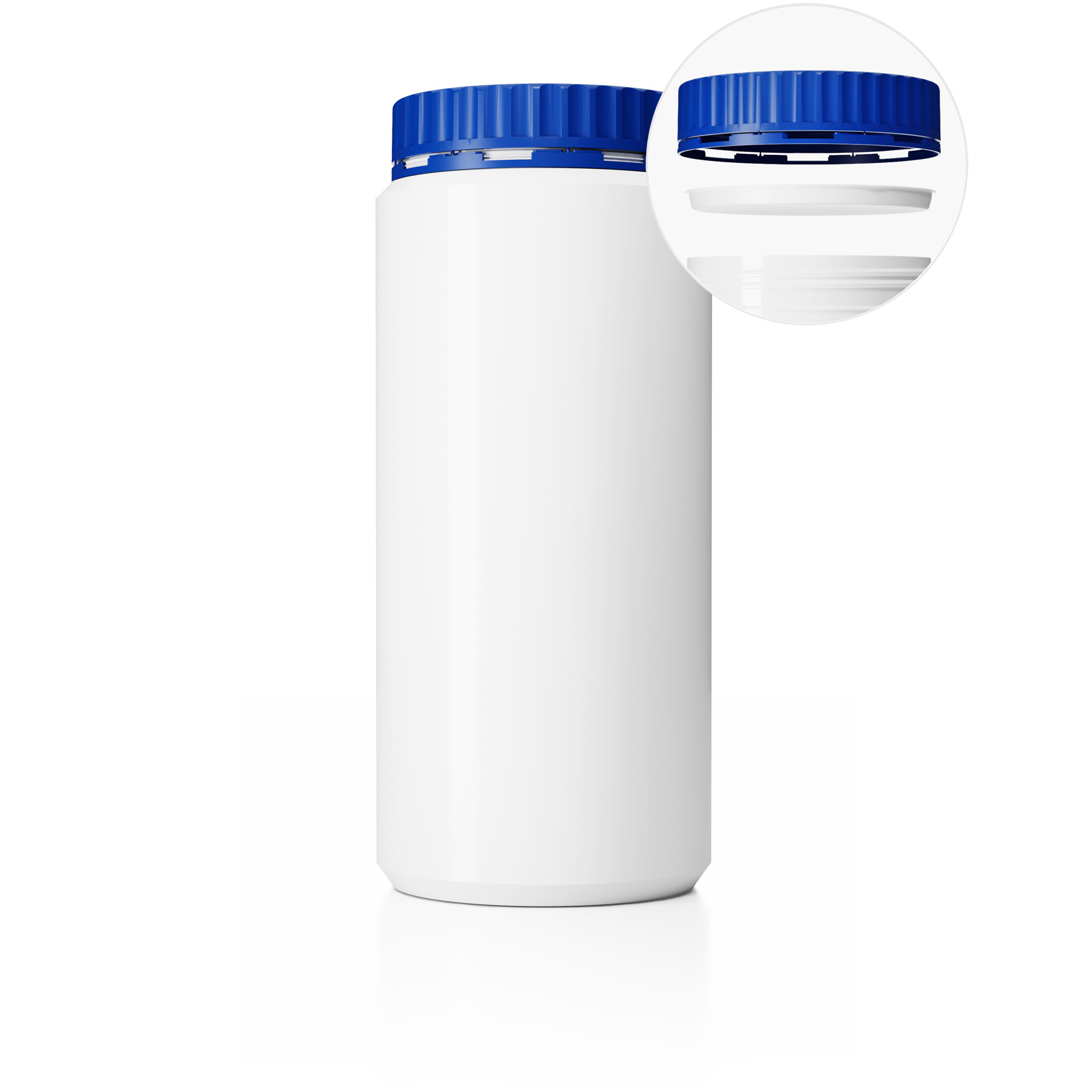 Dóza DL-M 100/91_1600 a Uzávěr DL-MZ ø 91 mm vč. mezivíka Plastová dóza HDPE, objem 1600ml, barva dózy bílá a barva uzávěru modrá