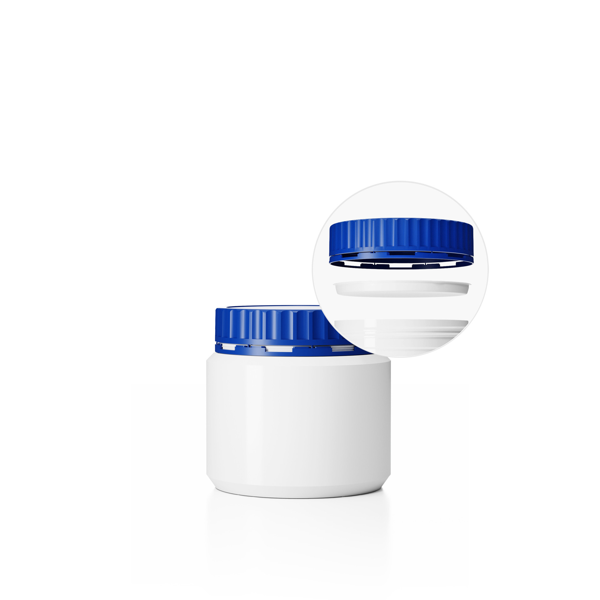 Dóza DL-M 100/91_600 a Uzávěr DL-MZ ø 91 mm vč. mezivíka Plastová dóza HDPE, objem 600ml, barva dózy bílá a barva uzávěru modrá