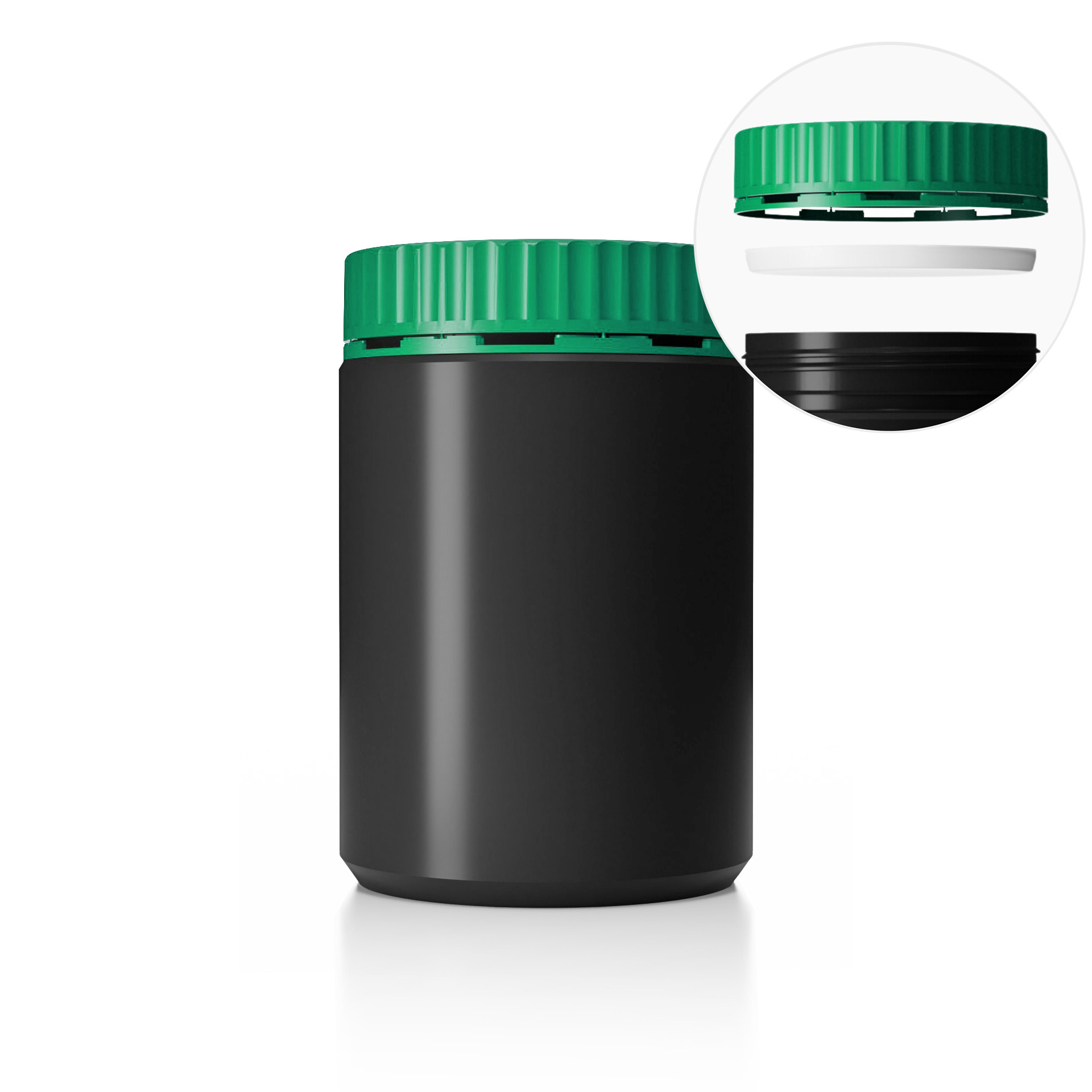Dóza DL-M 124/121_2000 a Uzávěr DL-MZ ø124mm vč. mezivíka Plastová dóza HDPE, objem 2000ml, barva dózy černá a barva uzávěru zelená