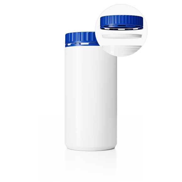 Dóza DL-M 94/91_1200 a Uzávěr DL-MZ ø 91 mm vč. těsnění Plastová dóza HDPE, objem 1200ml, barva dózy bílá a barva uzávěru modrá