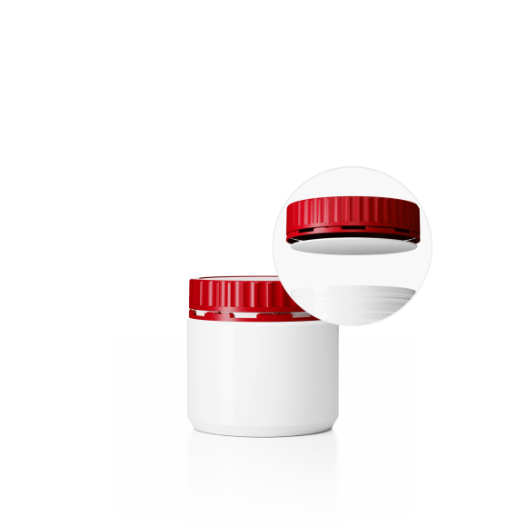 Dóza DL-M 94/91_500 a Uzávěr DL-MZ ø 91 mm vč. těsnění Plastová dóza HDPE, objem 500ml, barva dózy bílá a barva uzávěru červená
