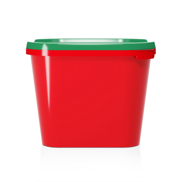 Obdélníkový kelímek DL 005_2000 a Obdélníkové víčko DL 005 velké červená barva, objem 2000 ml, a zelené víčko velké